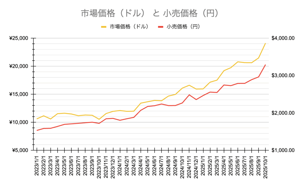 ※基本的には市場価格に対して小売価格は日本円で約1,500円ほど上乗せされる価格となります。